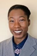 A woman with short curly hair, glasses, and earrings smiles at the camera. She is wearing a pink blazer, a light top, and a gold necklace, with a neutral gray background.